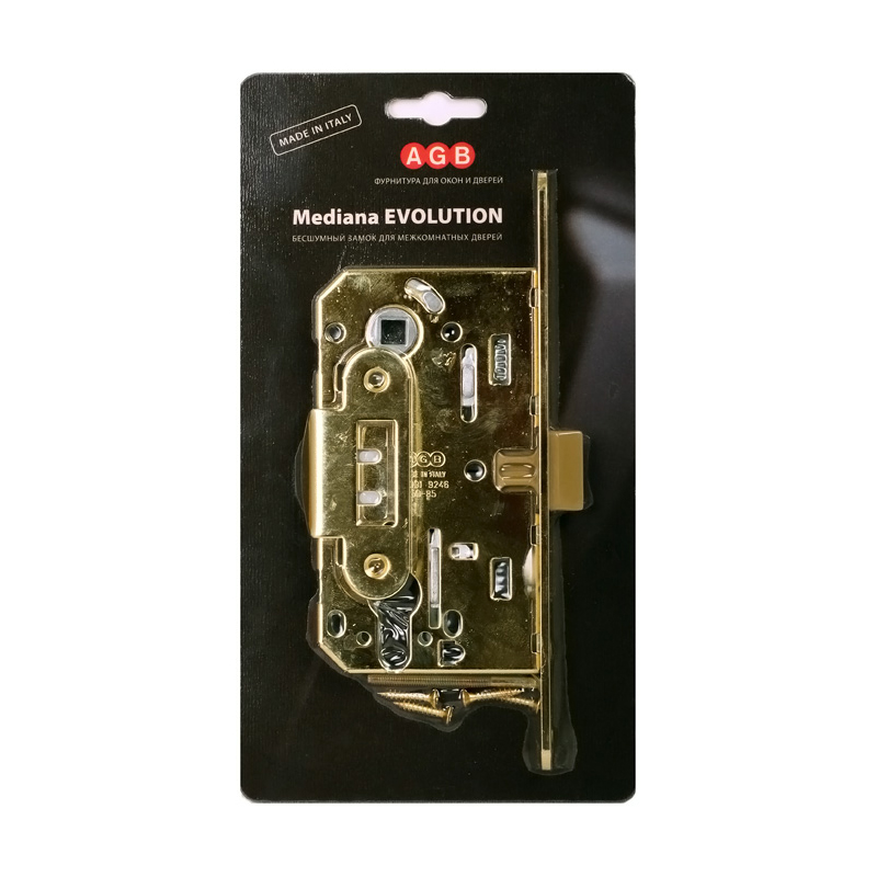 B01103.50.03.567 Замок межкомнатный под цилиндр в комплекте с ответной планкой. Блистерная упаковка. Цвет латунь. Защелка MEDIANA EVOLUTION  с пластиковым язычком отличается бесшумностью при закрывании.  Она разработанна инженерами компании AGB и объединяет в себе надежность, качество используемых материалов,  точность механических соединений и инновации. Все замки серии Evolution имеют один размер и взаимозаменяемы между собой.