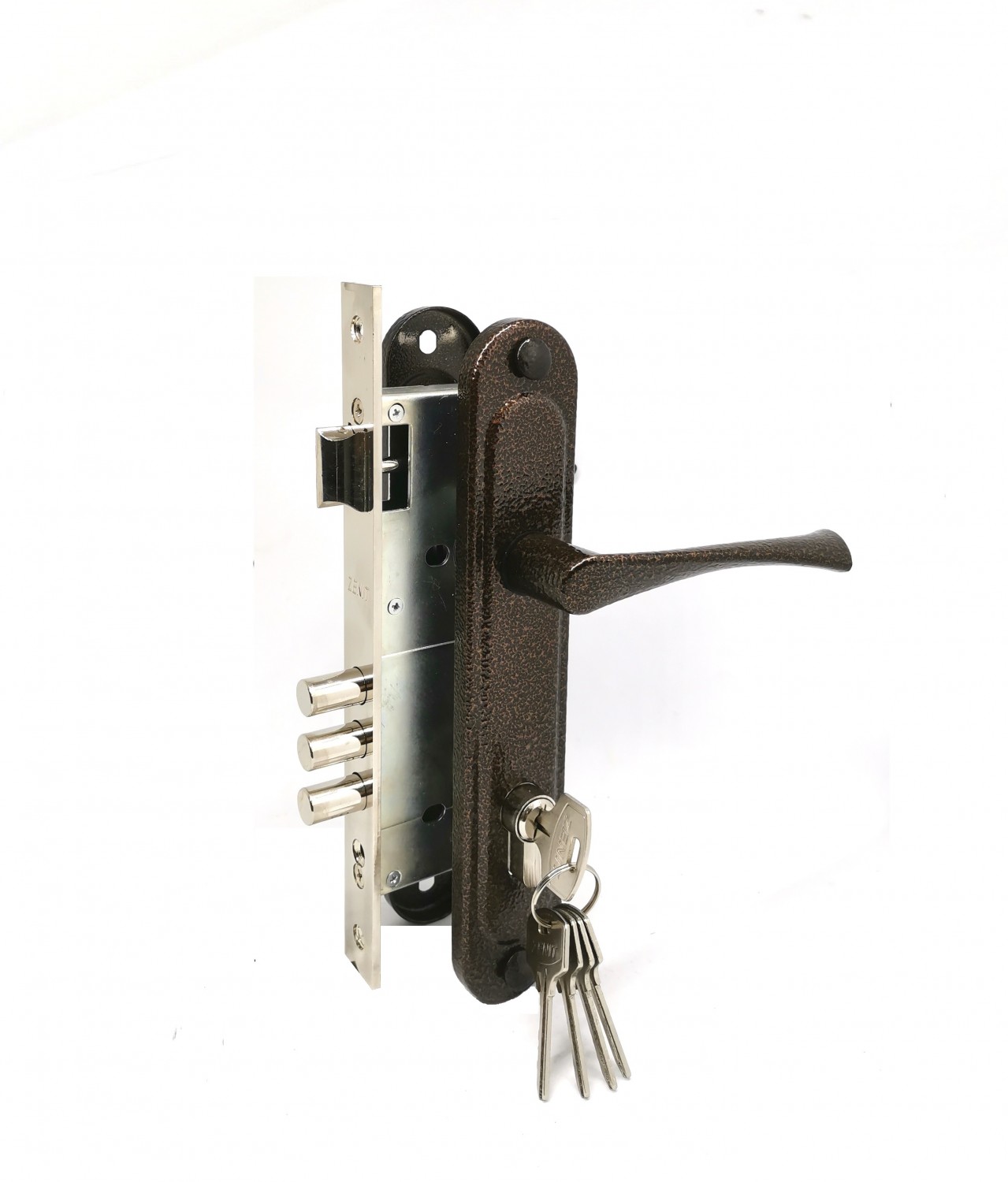 Замок врезной цилиндровый ЗВ4-85.3 в комплекте с ручкой предназначен для установки в легкие двери. Корпус замка, засов выполнены из стали, ручки из алюминия с гальваническим покрытием. Межосевое расстояние 85 мм. Цвет: медь.