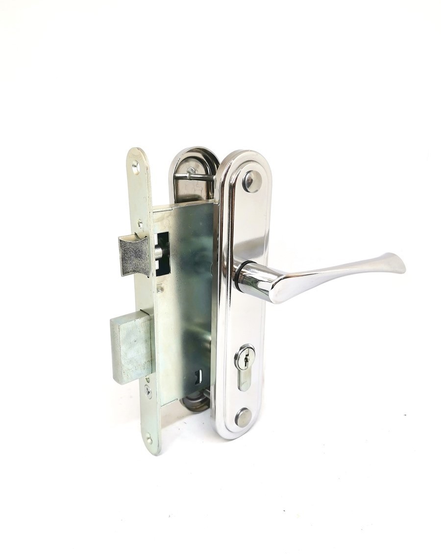 Замок врезной ЗВ7 с ручками предназначен для установки в деревянные и стальные двери толщиной до 50 мм, правого и левого открывания. Ригель прямоугольный. Материал ригеля и защелки выполнен из цинкового сплава. Межосевое расстояние 55 мм. Ручки на планке покрыты полимерной краской, цвет: хром лак. В фалевые ручки добавлены пружины и фиксаторы, что исключает «провисание» ручек и обеспечивает четкую фиксацию их положения. Комплектуется цилиндровым механизмом 70 мм, 4-мя ключами, ответной планкой и винтовыми стяжками.