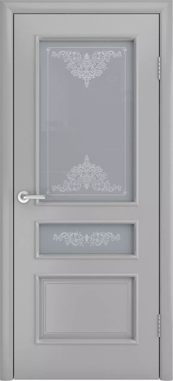 Дверь Голд-2 ДО имеет сборную конструкцию с фрезерованной поверхностью полотна. Также доступна узорная фрезеровка на нижней филенке с одной или двух сторон. Накладной багет можно сделать на выбор с фрезеровкой «косичка» или без нее. Модель покрыта эмалью и остеклена на выбор стеклом с пескоструйным рисунком, матированным стеклом с золотым рисунком, матированным стеклом с гравировкой или наливным витражом.