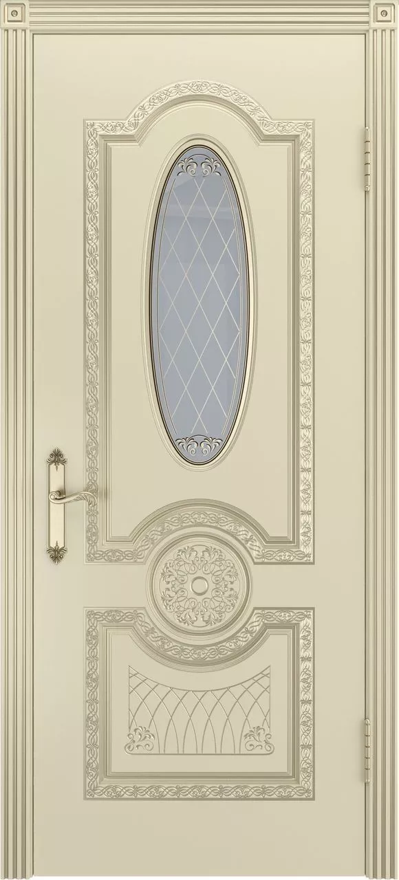 Дверь Гармония В3 ДО имеет каркасно-щитовую конструкцию с фрезерованной поверхностью полотна, имитирующей филенки. Также имеется фигурная фрезеровка на «филенках» и между ними. Остекление с фотопечатью, покрыта эмалью. Двери доступны только с нанесением патины.