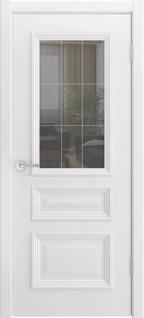 Дверь Скалино-5 ДО имеет каркасно-щитовую конструкцию с фрезерованной поверхностью полотна, имитирующей филенки, и цельным багетом. Модель покрыта эмалью и остеклена рефлективом либо сатинатом. Также на выбор можно нанести фотопечать либо графировку на стекло.