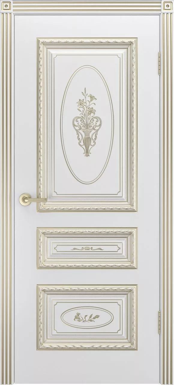 Дверь Трио R В3 ДГ имеет каркасно-щитовую конструкцию с фрезерованной поверхностью полотна, имитирующей филенки, и цельным багетом с узором «косичка». Также имеется фигурная фрезеровка на «филенках». Модель покрыта эмалью.
