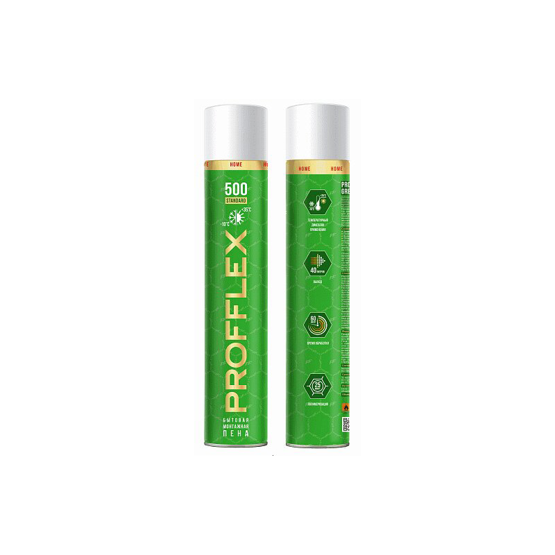 PROFFLEX HOME 500 standard идеальна при мелкой разовой бытовой работе.Высокопроизводительная однокомпонентная полиуретановая пена, предназначенная для работы в диапазоне температур от -10 °С до +35 °С.Пена применяется для уплотнения монтажа окон и дверей, заполнения пустот, щелей, герметизации стыков  обеспечения тепло- и звукоизоляции  уплотнения монтажа строительных конструкций. Простоту применения пены обеспечивает направляющая трубка (в комплекте с баллоном).