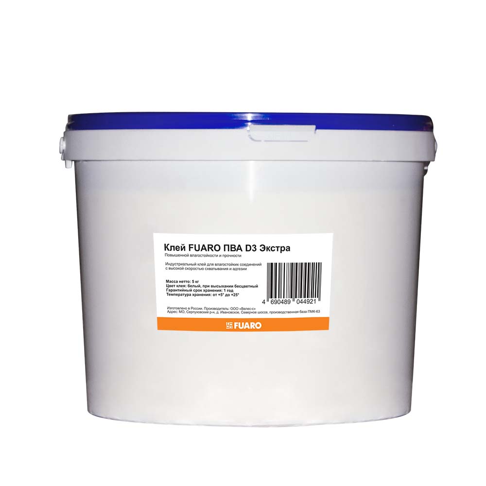 Клей ПВА Экстра повышенной влагостойкости и прочности - индустриальный клей для ответственных влагостойких соединений, качество склеивания D3 усиленное. Упаковка - бочка 5 кг.Применяется для ответственных столярных работ: склеивания изделий из дерева, ДСП, ДВП, МДФ, картона, плитки, обоев, паркета и других строительных материалов. Незаменим в изготовлении окон, дверей, лестниц, в ламинации и шпонирования дверных полотен, мебели и т.п.Образует клеевой шов, превышающий прочность древесины. *Высокая адгезия при склеивании твердых и экзотических пород древесины*Высокая скорость схватыванияПримерный расход материала 80-160 г/кв. м.Клей хранится в оригинальной закрытой упаковке при температуре + 5°С - + 30°С, 12 месяцев.Окончательная прочность и влагостойкость клеевого шва достигаются через 24 часа.Методы нанесения клеёв ПВА : Кистью, шпателем или клее наносящим валикомКлее наносящими устройствами в рамных прессах и  в установках для сращивания на мини-шипКлее наносящими приборами