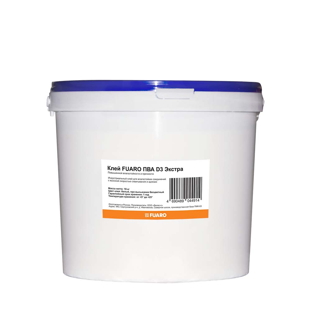 Клей ПВА Экстра повышенной влагостойкости и прочности - индустриальный клей для ответственных влагостойких соединений, качество склеивания D3 усиленное. Упаковка - бочка 18 кг.Применяется для ответственных столярных работ: склеивания изделий из дерева, ДСП, ДВП, МДФ, картона, плитки, обоев, паркета и других строительных материалов. Незаменим в изготовлении окон, дверей, лестниц, в ламинации и шпонирования дверных полотен, мебели и т.п.Образует клеевой шов, превышающий прочность древесины. *Высокая адгезия при склеивании твердых и экзотических пород древесины*Высокая скорость схватыванияПримерный расход материала 80-160 г/кв. м.Клей хранится в оригинальной закрытой упаковке при температуре + 5°С - + 30°С, 12 месяцев.Окончательная прочность и влагостойкость клеевого шва достигаются через 24 часа.Методы нанесения клеёв ПВА : Кистью, шпателем или клее наносящим валикомКлее наносящими устройствами в рамных прессах и  в установках для сращивания на мини-шипКлее наносящими приборами