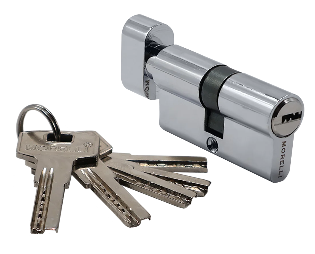 Ключевой цилиндр повышенной секретности для двери вставляется в замок или защелку для закрытия ключом с одной стороны помещения и поворота кноба с другой, дополняя общую конструкцию.