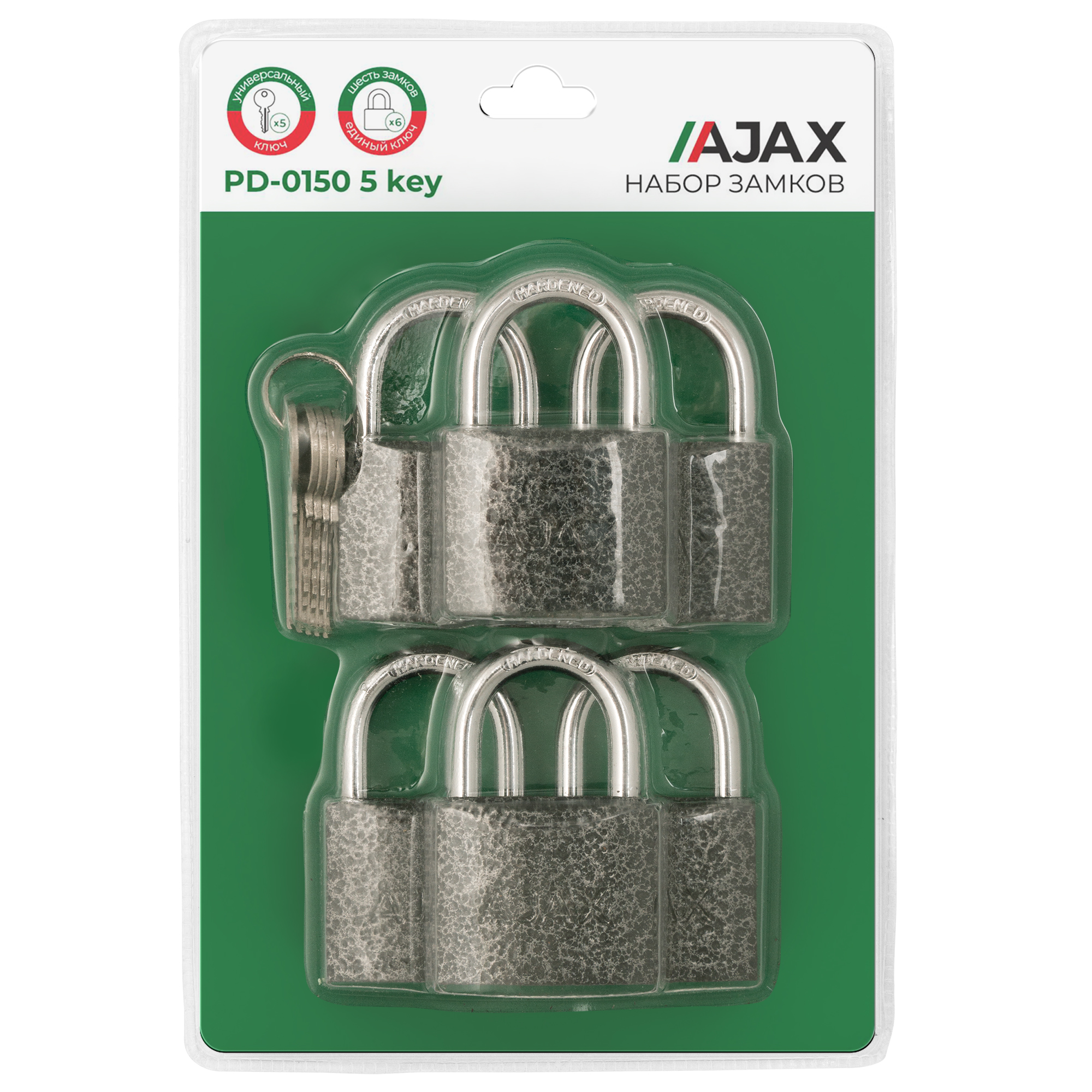 Набор навесных замков AJAX серии PD-01 предначен для запирания внешних и внутренних дверей, оснащенных проушинами. Чугунный корпус с антикоррозийным покрытием, закаленная подпружиненная дужка, автоматическое запирание.Внутри набора реализована мастер-система, то есть каждый замок из набора можно открыть любым ключом из связки. В наборе 6 замков и 5 английских ключей.Упаковка: блистер. Гарантия: 1 год.
