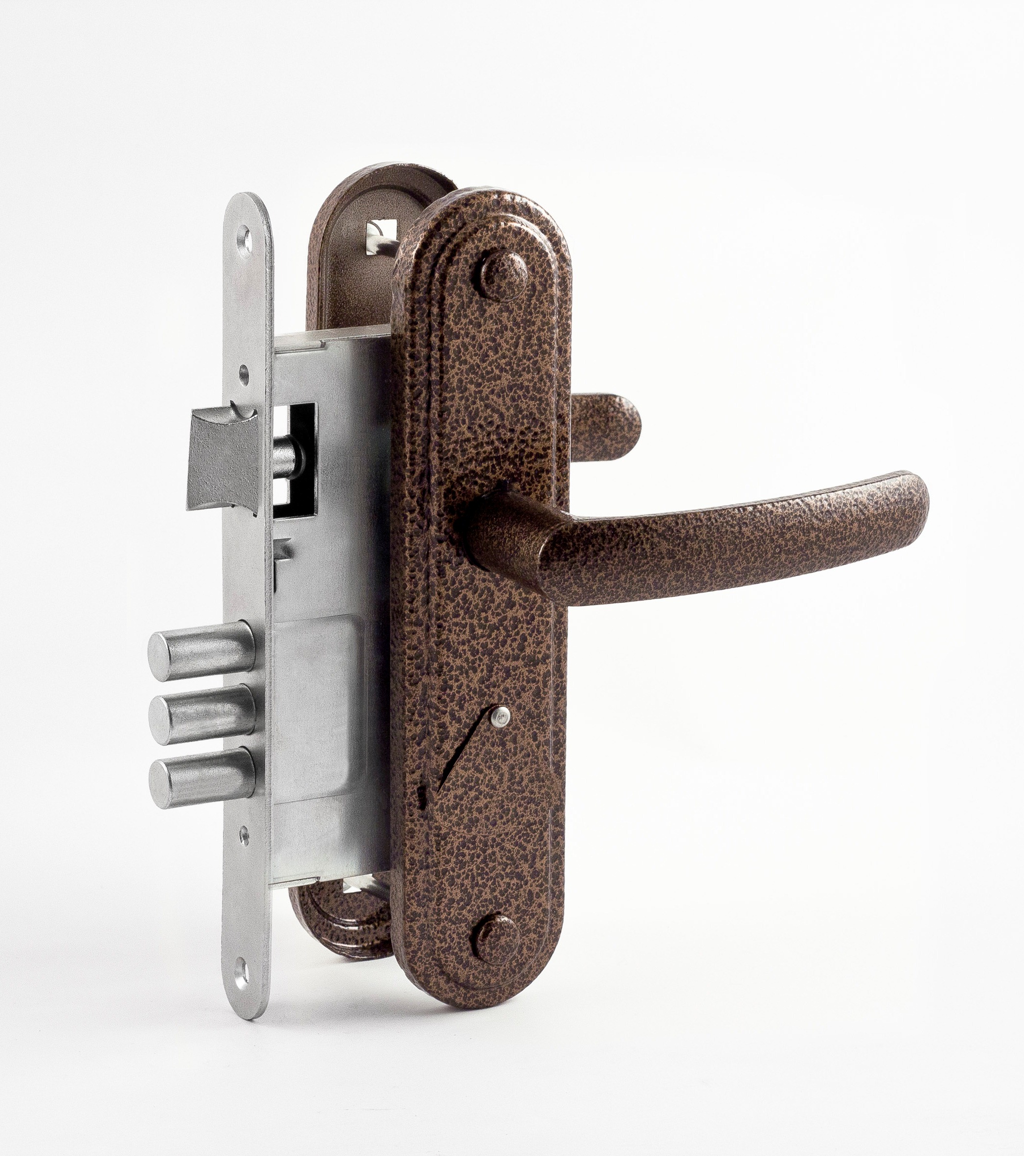Замок врезной сувальдный ЗВ9.1-02 с межосевое расстояние 67 мм, удаление отверстия под ключ 55 мм. Засов из 3 стальных цилиндрических ригелей диаметром 12 мм. Ручки-накладки покрыты полимерной краской. В ручки фалевые добавлены пружины и фиксаторы, что исключает провисание ручек и обеспечивает четкую фиксацию их положения. Замок предназначен для установки в деревянные и стальные двери толщиной до 50 мм, правого и левого открывания. Комплектуется 3-мя ключами, ответной планкой и крепежной фурнитурой. Цвет: бронза.