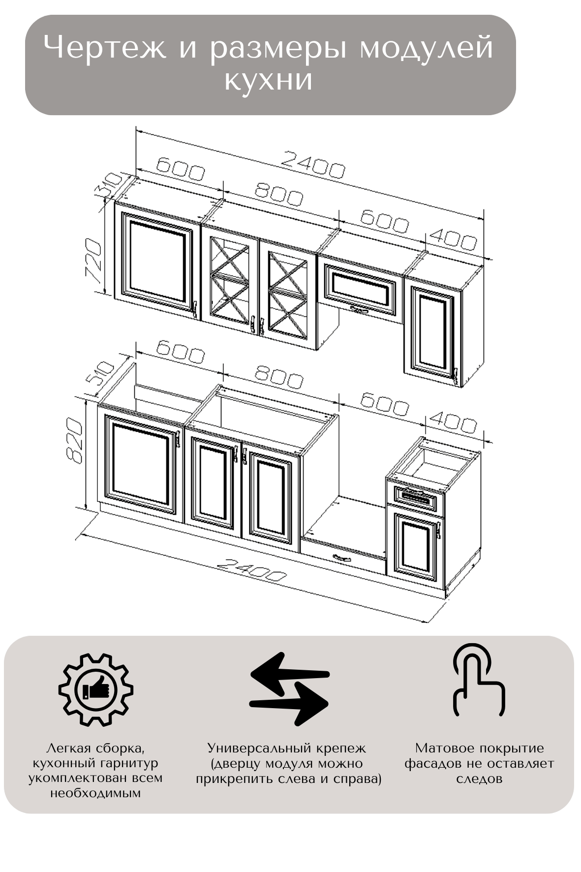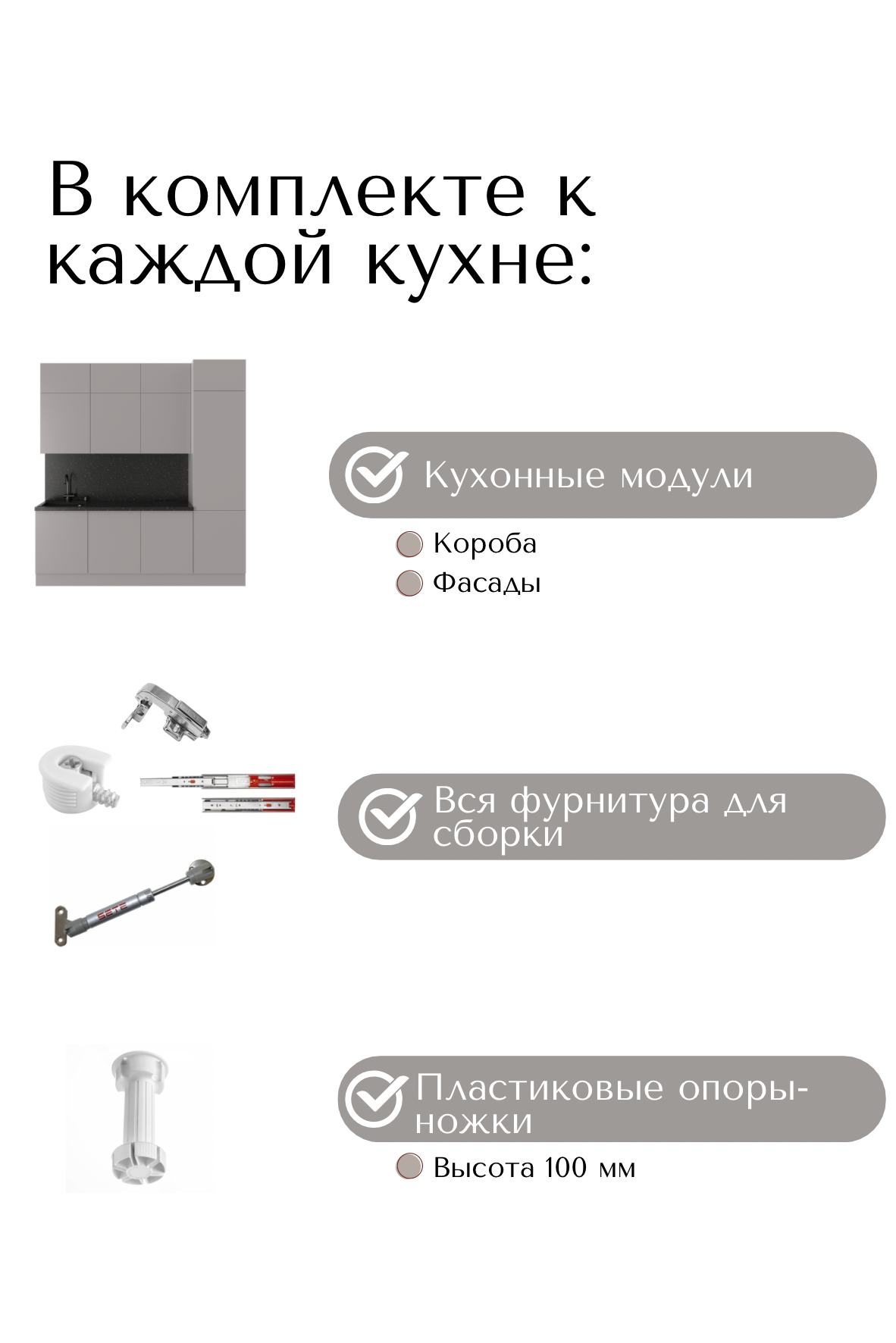 В комплект входит: верхние, нижние модуля (корпус и фасады), все крепления, ножки-опоры регулируемые от 100 до 150 мм.