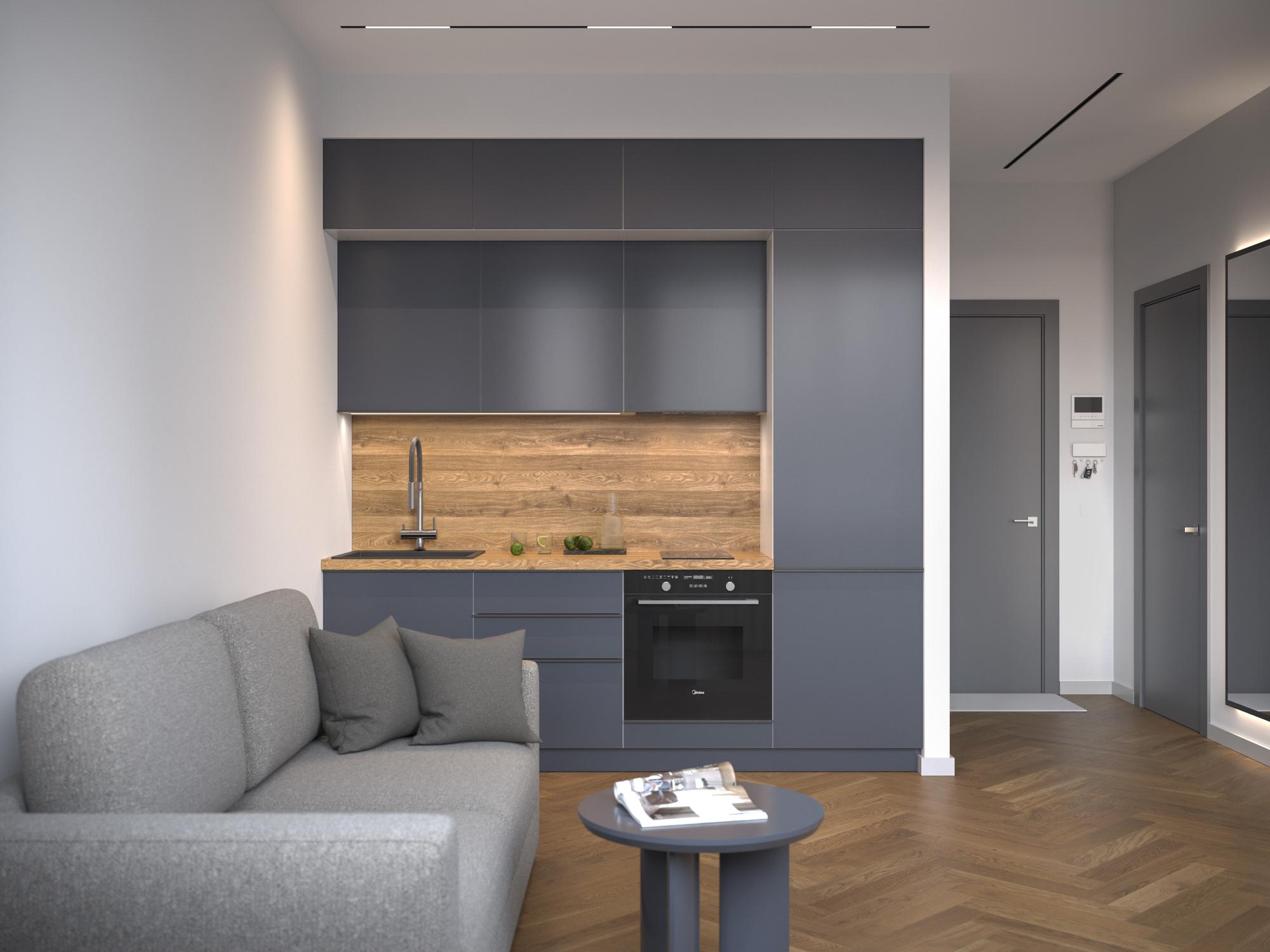 Дополнительно приобретается: пластиковый цоколь, высота подбирается в зависимости от выстроенной высоты ножек от 100 до 150 мм, столешница (предусмотрена толщина как 28 мм, так и 38 мм), техника, мойка, ручки (могут быть использованы как торцевые, так и фасадные).
