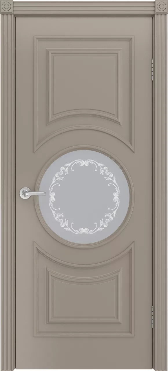 Дверь Адриана ДО имеет сборную конструкцию с фрезерованной поверхностью полотна, имитирующей филенки, и накладным багетом. Модель покрыта эмалью и остеклена на выбор стеклом с пескоструйным рисунком, матированным стеклом с золотым рисунком, матированным стеклом с гравировкой или наливным витражом. Остеклена центральная филенка (круг).