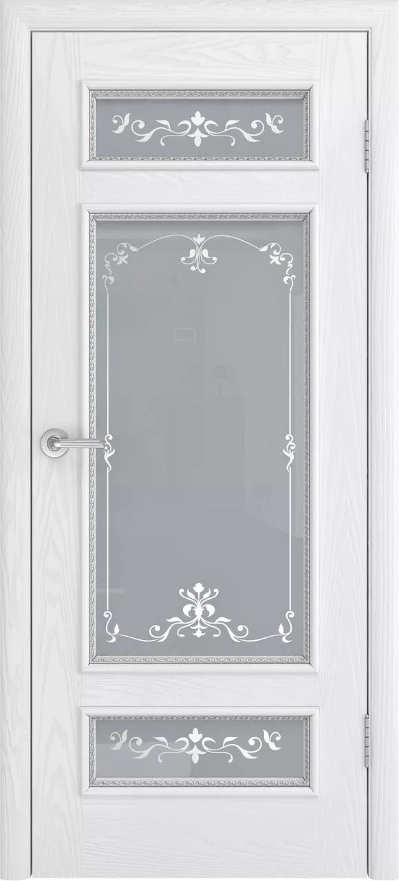 Дверь Золото-4 ДО имеет каркасно-щитовую конструкцию с фрезерованными филенками и роскошным багетом. Модель покрыта натуральным шпоном ясеня и остеклена сатинированным стеклом с фотопечатью, гравировкой или пескоструйным рисунком на выбор.