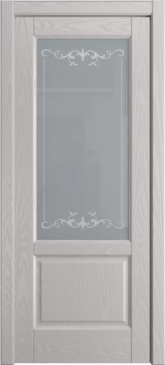 Дверь Ровена ДО имеет сборную конструкцию с фрезерованными филенками. Модель остеклена светлым или матовым стеклом с золотой фотопечатью или пескоструйным рисунком и покрыта натуральным шпоном ясеня или дуба на выбор.