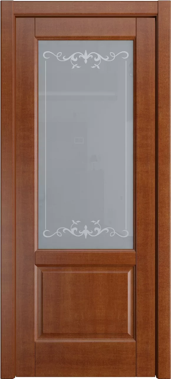 Дверь Ровена ДО имеет сборную конструкцию с фрезерованными филенками. Модель остеклена светлым или матовым стеклом с золотой фотопечатью или пескоструйным рисунком и покрыта натуральным шпоном ясеня или дуба на выбор.