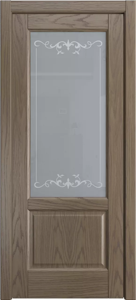 Дверь Ровена ДО имеет сборную конструкцию с фрезерованными филенками. Модель остеклена светлым или матовым стеклом с золотой фотопечатью или пескоструйным рисунком и покрыта натуральным шпоном ясеня или дуба на выбор.