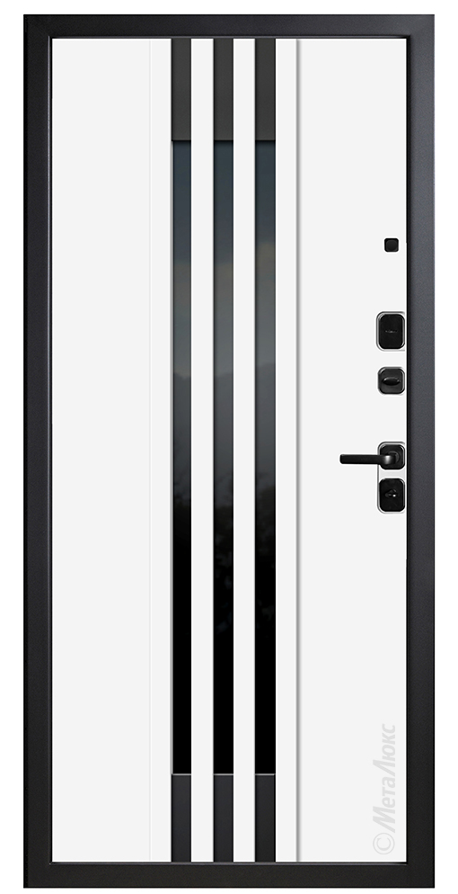 Панель МДФ 16 мм, пленка SoftVelvet, цвет «Белый» (17)/декоративный штапик цвет «Белый» (17), вставка из черного глянцевого стекла, черная металлическая вставка