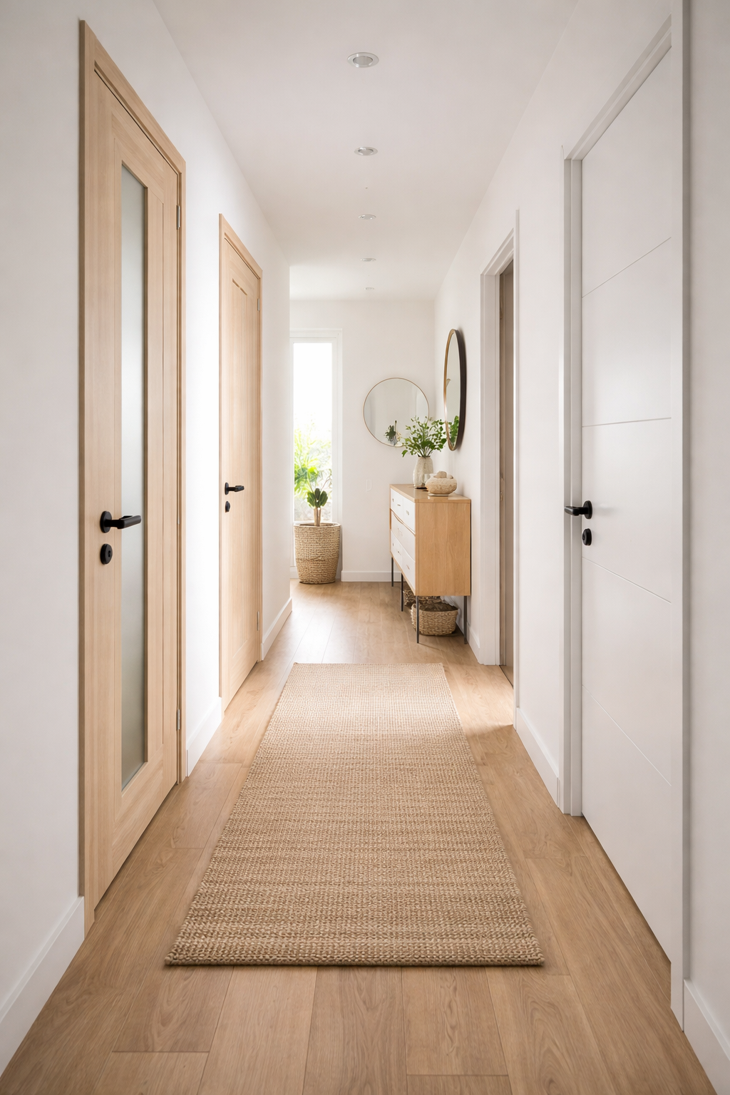 - светлые двери + чуть более тёмный пол — пол «заземляет» помещение, двери дают ощущение высоты и простора.
