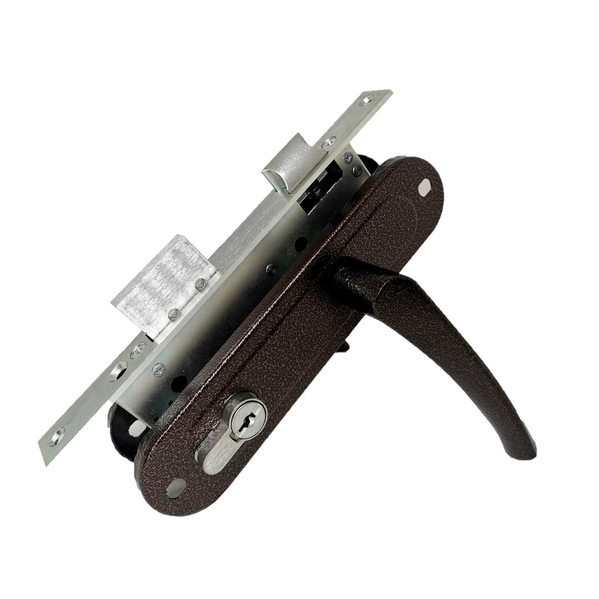 Замок врезной с ручками. Предназначен для установки в деревянные двери толщиной до 45мм, правого и левого открывания. Ригель прямоугольного сечения, вылет 20мм. Универсальная защелка. Стальной корпус покрыт гальваническим покрытием. Межосевое расстояние 70 мм. Удаление ключевого отверстия 40мм. Материал ручек алюминиевый сплав. Ручки оснащены пружинами. Комплектация: замок, цилиндровый механизм 70мм, 4 ключа, ручки, ответная планка, винтовые стяжки.